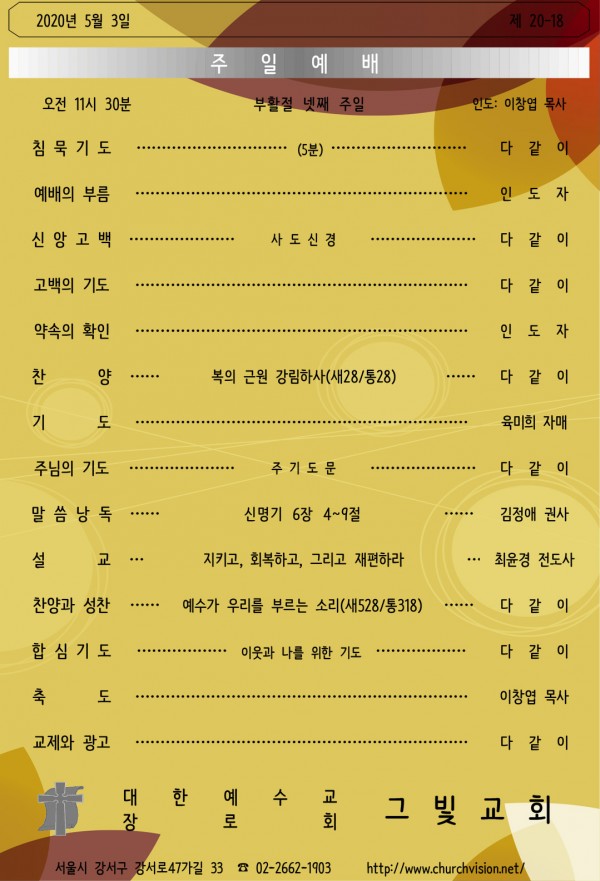 2020년 5월 3일 부활절 넷째 주일 예배 안내입니다.