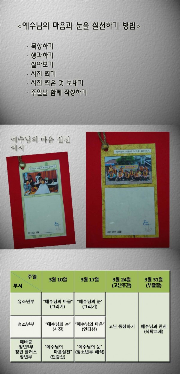 안녕하세요 기획부입니다. 부활절 예배를 기다리며 할 것입니다. 이번주 금요일(3월 8일까지 명은 자매에게 사진 전송해 주세요 참고로 핸드폰을 가로로 두고 찍으세요.